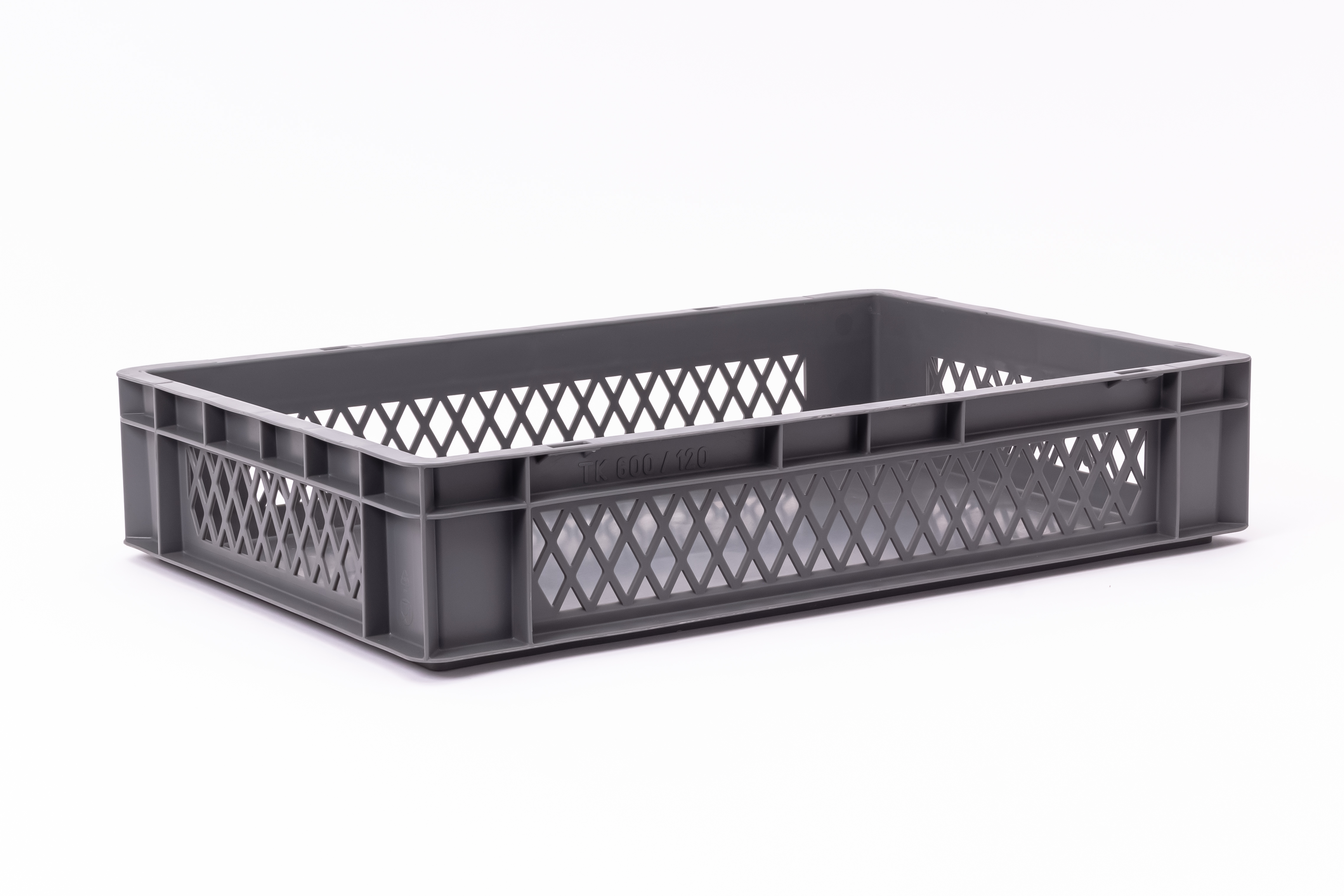 Stapelbak met geperforeerde zijwanden, handige greeplijsten en een inhoud van 20 liter. Model in grijs.